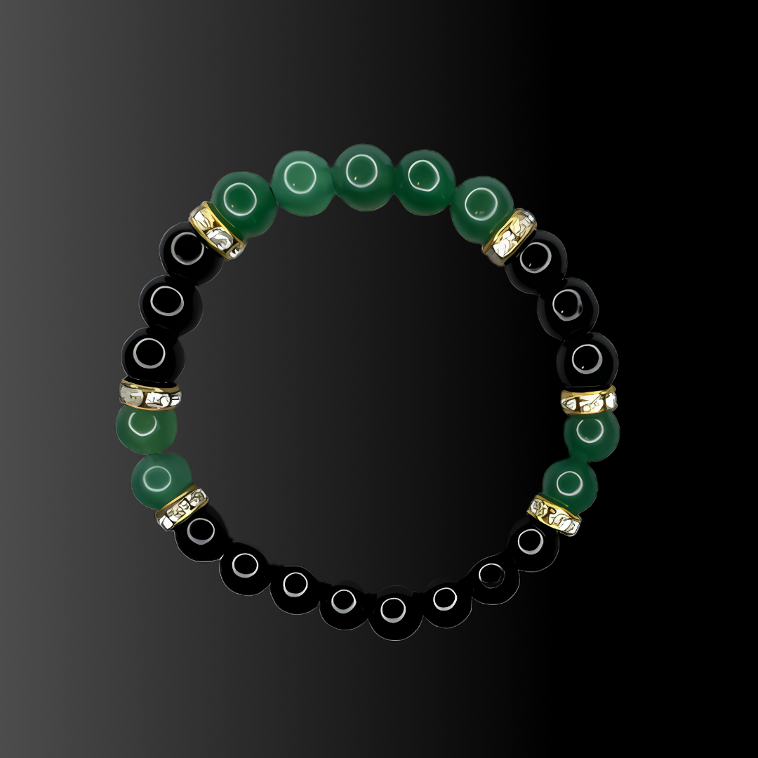 Green glass beads, black glass beads, & gold rhinestone beads with crystal spacers. The bead size is 8 mm. Each design is for men or women.